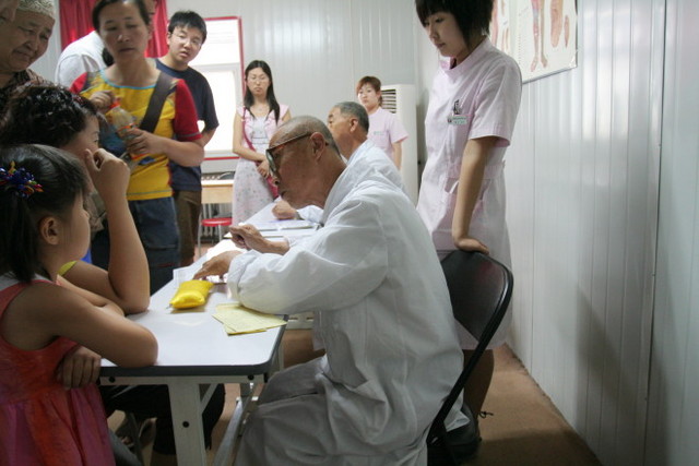 破舊的三合院,現代化的冷氣房,時髦的俏護士,光頭的老醫師,非常奇怪的組合。某知名中醫博士沒有重點地講了五分鐘左右現代人的文明病症狀後,又進來另外三位穿白袍的老醫師,一字排開,說是要替大家免費義診。我和吳老爺坐在最後面吹冷氣看熱鬧。第一位慷慨就義的是位歐巴桑,醫師幫她把脈之後說道:「妳是不是失眠、心悸、口乾舌燥、胸口鬱悶?」歐巴桑點頭如搗蒜,醫師又說:「這是肝病的前兆,如果不盡早治療,以後會導致癌症。我給妳開個藥方,只要服用三帖即可痊癒,每一帖RMB300元,要付現還是刷卡?(說得像順口溜似的)」接下來,一堆人爭先恐後上前去看診,我和吳老爺相視而笑,把相機掛在胸前混在人群中偷拍,然後趁亂溜出房間。