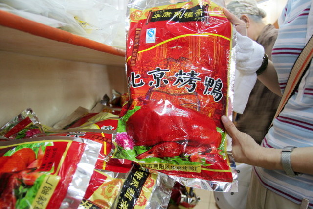 車子開出百生堂不到5分鐘,隨即開進一家土產店,下車前導遊再三叮囑,裡面可以免費品嚐北京烤鴨,由於是免費的,所以切得比較小片,請大家多拿幾支牙籤,才能多叉一些。