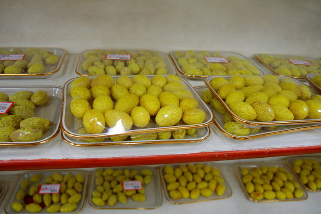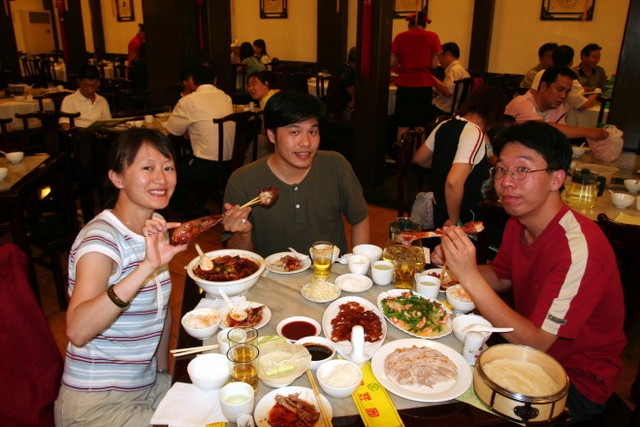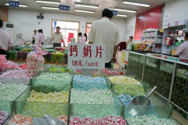 走進店裡一看,長長一桌品嚐台上擺滿各式各樣的土產試吃品,我們卻一點嘗試的意願都沒有,有盤切碎碎的烤鴨屑,早就被一掃而空。賣場裡迷宮狀的陳列方式,一旦進去,就得走完全程才出得來,所有的糖果和蜜餞,顏色鮮艷得嚇人,價格還不便宜哩!我們覺得很新奇,拿著相機亂亂拍,大部分團員卻是拼命地狂吃狂買,消費能力非常驚人。