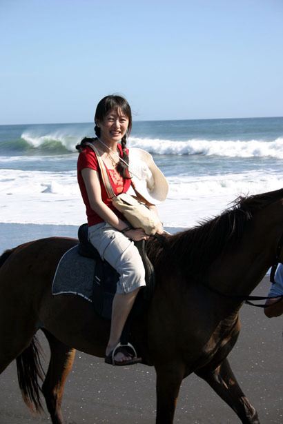 沒騎過馬的凱西,在訓練師協助之下,以狼狽的姿勢跨上了馬背,馬兒似乎不悅地嘶叫了兩聲,即使全程由訓練師牽著馬在沙灘上散步一圈,我的心裡還是忐忑不安。