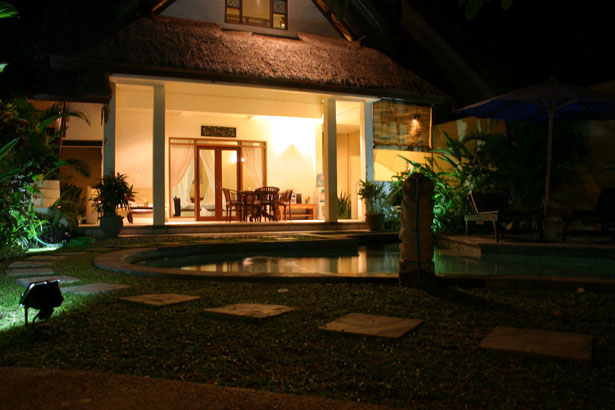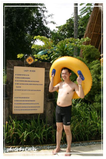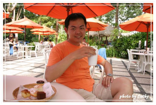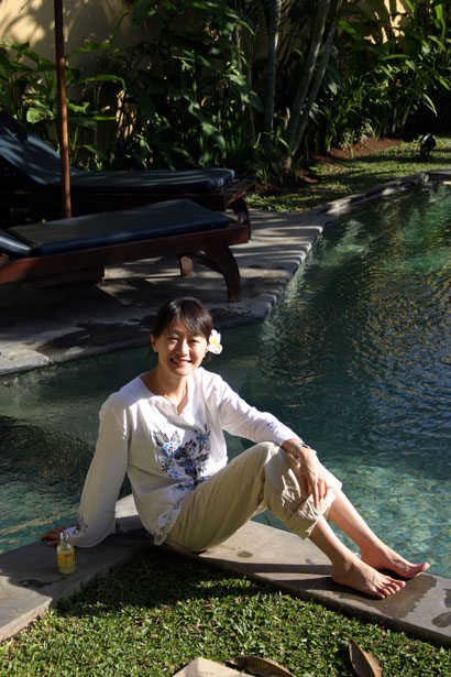 CD來播放。一樓房間的落地窗面對著充滿熱帶景致的花園和泳池,室內擺設簡單素雅,中國風的桌椅與化妝台,垂掛著白色紗幔的大床,柔和的色調與燈光,給人溫馨舒適的感覺。房間後方是寬敞的半露天式衛浴,雖然經過巧妙設計,保持充分的隱密性,心裡還是難免覺得不自在。