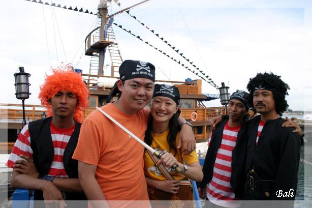 傍晚,遊覽車抵達了碼頭,船桅上飄揚著骷髏旗的仿古海盜船就停泊在港邊,導遊將海盜頭巾、獨眼罩、面具分發給我們,大夥兒開心地你幫我我幫你穿戴起來,拿起大刀和海盜嘍囉們拍照。