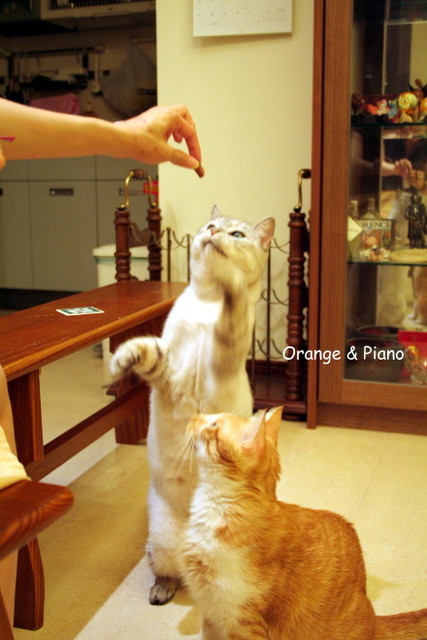 Vita肉條的時候,其實是橘一口痞諾一口,沒有偏心誰。但是吃完以後,空袋子竟然能讓痞諾表演精彩的「肥貓下腰」,哼哼!誰家