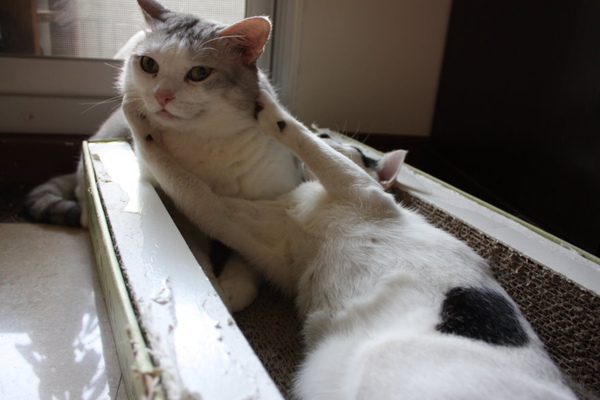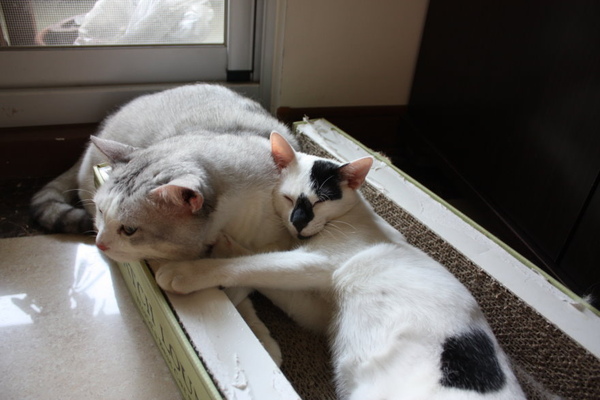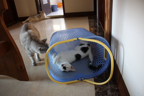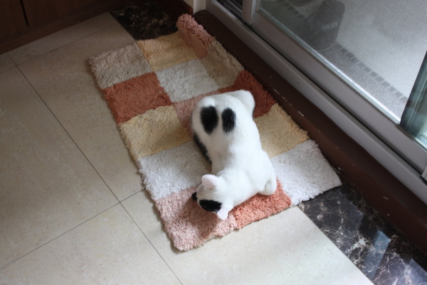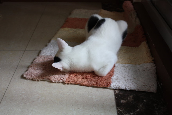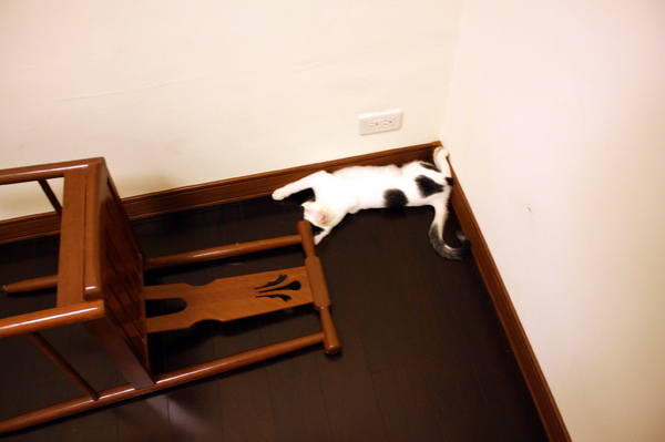 黑鼻流浪漢除了睡洗手台、笨斗、還會去房間角落貼牆睡。洗衣籃也可以。天冷了,門口的踏墊也是牠愛睡的地方,只是...姿勢很奇怪。有胖的證據,屁股長肉了。黑鼻:達哥陪偶睡覺。黑鼻:好軟的靠墊喔! Yoda:泥睡很爽,偶的肚子涼涼耶~